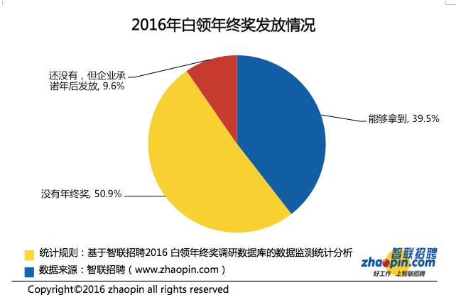 智聯(lián)招聘發(fā)布的《2016白領(lǐng)年終獎調(diào)查》顯示,只有39.5%的白領(lǐng)表示可以拿到年終獎,明顯高于2015年13.4%的比例,另外有9.6%的白領(lǐng)表示企業(yè)承諾會在年后發(fā)放年終獎。調(diào)查顯示,2016年年終獎的總體均值為12821元,整體水平較2015年略有上升,但仍低于2014年的13613元。金融行業(yè)和國企白領(lǐng)的年終獎均值最高,為1.7萬元。地區(qū)上,北京的年終獎均值最高,為15846元,上海、深圳和杭州分列其后。(美通社,2017年1月12日北京)