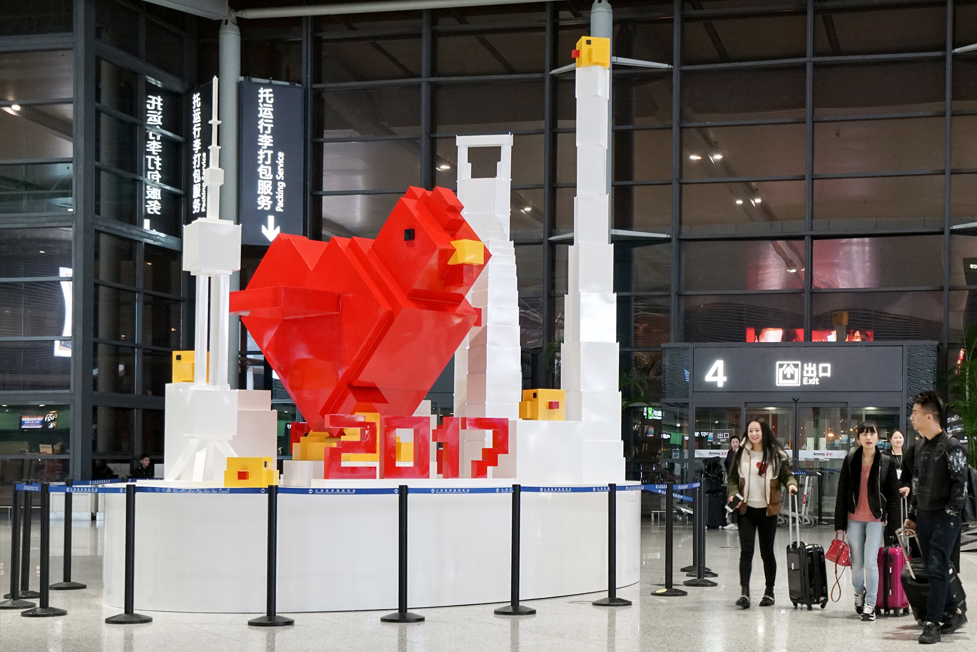 在上海虹橋國際機(jī)場(chǎng)2號(hào)航站樓出發(fā)及到達(dá)大廳,一組由上海機(jī)場(chǎng)德高動(dòng)量廣告有限公司策劃的方塊像素丁酉年“飛雞”藝術(shù)雕塑群吸引了很多人的目光。兩組藝術(shù)雕塑群分別位于到達(dá)大廳行李提取處南北兩側(cè),可愛的“飛雞爸爸”和“小黃雞寶寶們”的家庭組合,令每一位在春運(yùn)期間抵達(dá)虹橋機(jī)場(chǎng)的乘客都能感受到新年氛圍和回家的溫馨,活潑伶俐地展現(xiàn)了酉雞年新春主題。(美通社,2017年1月16日上海)