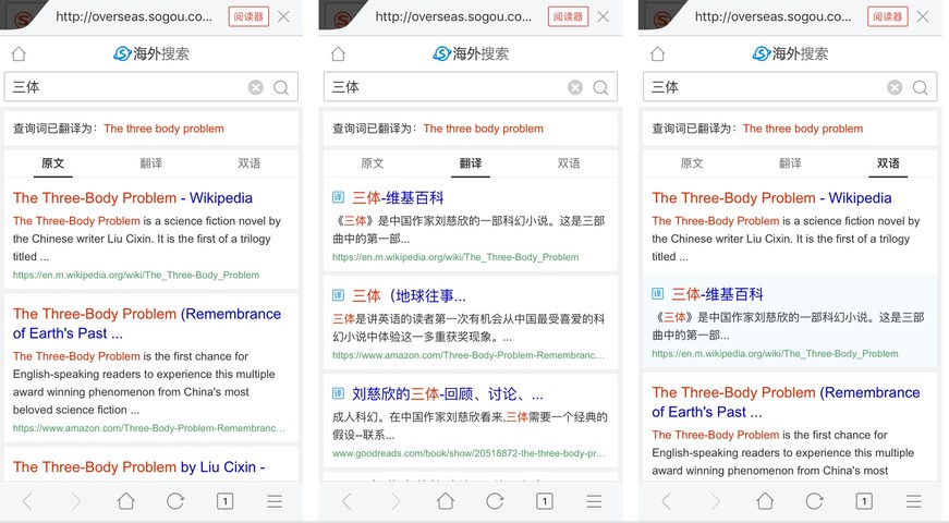 近日,搜狗將英文搜索全面升級為海外搜索,旨在幫助不精通英文的中國人搜索和閱讀全世界的醫(yī)療、科技及人文信息。用戶無論輸入中文還是英文,搜索結(jié)果在英文原文呈現(xiàn)外,新增了中文翻譯、中英雙語兩大頁面,服務(wù)于不精通英文的用戶。這是搜狗把深度神經(jīng)元網(wǎng)絡(luò)翻譯系統(tǒng)與搜索相結(jié)合打造的全新產(chǎn)品,也是全球首個提供功能的搜索引擎。(美通社,2017年1月17日北京)
