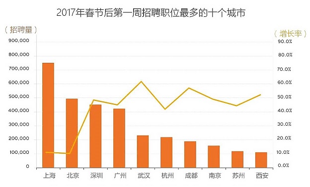 前程無憂的數(shù)據(jù)顯示,2月3日~2月9日期間,在前程無憂上的日均空缺職位超過487萬個,比去年同期增加了33.1%,人員流動和新企業(yè)增多成為節(jié)后才市井噴的主要原因。和去年同期相比,二線的主要城市用人需求大幅上升,其中武漢的招聘職位達到23萬個,比去年同期增加59.8%,成都的招聘需求也同比增長了55.3%。春節(jié)后計算機軟件、房地產(chǎn)開發(fā)和教育培訓(xùn)三大行業(yè)的崗位空缺快速增加,財務(wù)、行政和人力資源等支持類崗位的招聘量也出人意料地大幅增加。(美通社,2017年2月14日上海)