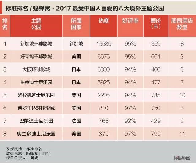 螞蜂窩近日聯(lián)合標準排名發(fā)布了“2017最受中國人喜愛的八大境外主題公園”排行榜,以境外主題公園的熱度、好評率、票價、周邊酒店數(shù)量等四項指標進行衡量。榜單顯示,2017最受中國人喜愛的八大境外主題公園是新加坡環(huán)球影城、好萊塢環(huán)球影城、大阪環(huán)球影城、東京迪士尼樂園、洛杉磯迪士尼樂園、佛羅里達環(huán)球影城、巴黎迪士尼樂園和奧蘭多迪士尼樂園。