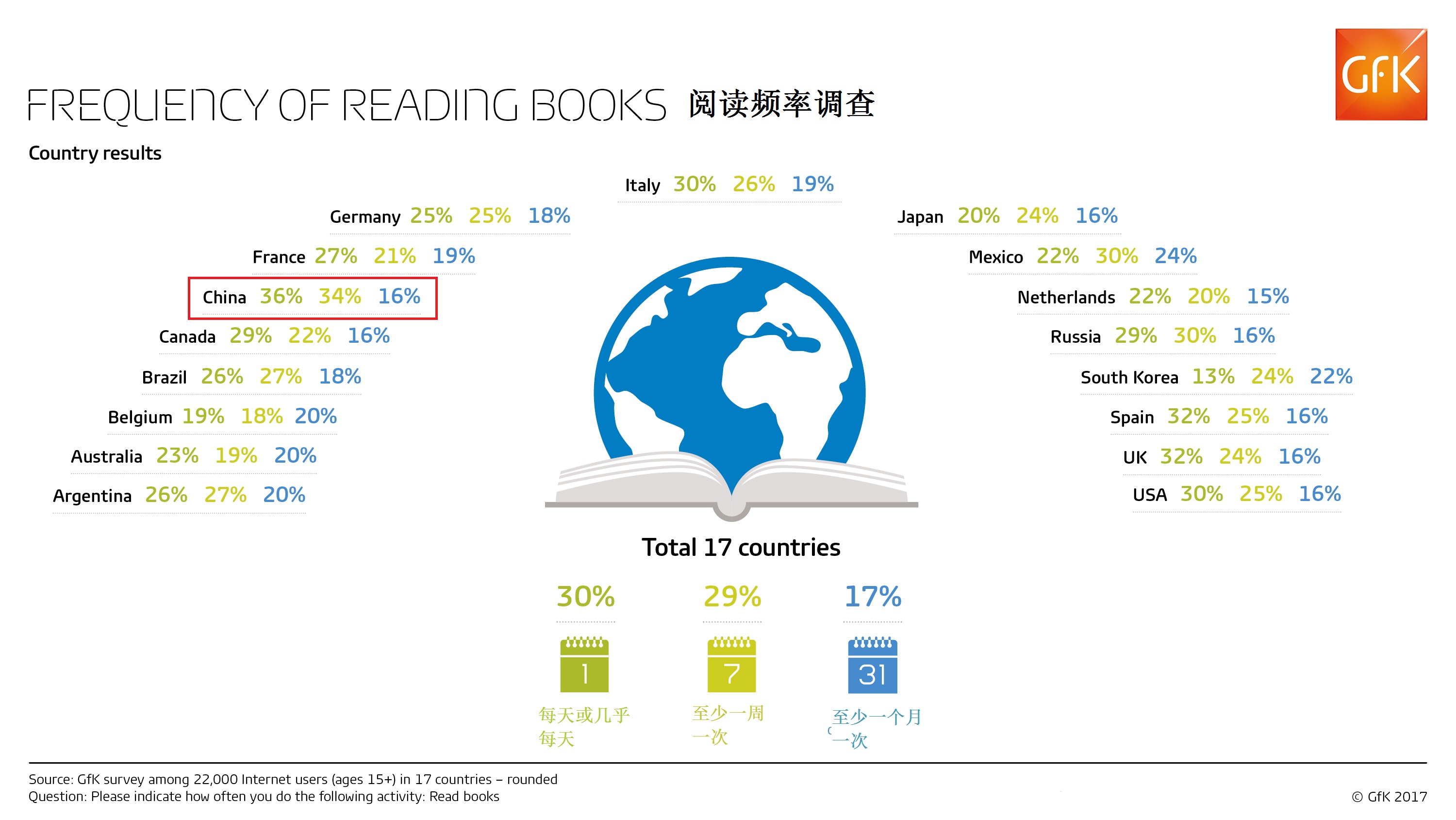 全球市場研究機(jī)構(gòu)GfK一項(xiàng)涵蓋17國的調(diào)查發(fā)現(xiàn),全球30%的網(wǎng)民保持著每天或幾乎每天進(jìn)行閱讀的習(xí)慣,中國以36%的比例位列第一,其后分別是西班牙和英國(均為32%)。如果算上每天和每周至少一次閱讀的人,這個比例在全球達(dá)到59%,中國更是以70%的比例遙遙領(lǐng)先。調(diào)查還發(fā)現(xiàn),高收入家庭比低收入家庭更愛讀書,女性比男性愛讀書。而最不愛閱讀的是荷蘭和韓國,這兩個國家均有16%的網(wǎng)民表示他們從不閱讀。(美通社,2017年3月23日德國紐倫堡)
