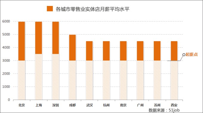 從城市來(lái)比較,各一線及準(zhǔn)一線城市零售業(yè)店員平均工資差距不大,區(qū)間均在3-5K/月,像北京、上海、深圳這樣的超大型一線城市,平均工資可以達(dá)到每月6K。