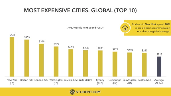 全球最大的學(xué)生住宿平臺(tái)student.com發(fā)布了一份全球?qū)W生住宿指數(shù)報(bào)告。報(bào)告發(fā)現(xiàn),對(duì)學(xué)生而言,房租最貴的城市分別是紐約、波士頓和倫敦,而最便宜的三個(gè)城市都在美國(guó)境內(nèi),分別是奧本、阿森斯和塔拉哈西。這份排名是student.com根據(jù)其網(wǎng)站租房數(shù)據(jù)得出的。在紐約的學(xué)生每周花在住宿上的開銷達(dá)431美元,比全球平均水平高出98%。(美通社,2017年5月22日倫敦)