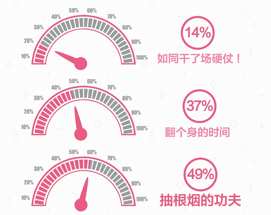 男性健康領(lǐng)導品牌之一“必利勁”聯(lián)合多家醫(yī)藥電商平臺開展了一場男性持久度調(diào)查。本次調(diào)查主要是針對各大醫(yī)藥電商超過1000位曾經(jīng)購買過男科產(chǎn)品的會員。結(jié)果顯示,70%的調(diào)查對象認為“為愛情鼓掌”是生活中自己最在意的事情。但“鼓掌”的過程似乎不盡如人意:有近4成的調(diào)查對象表示自己的這個過程也就是翻個身的功夫,說明時間較短,滿意度較低。