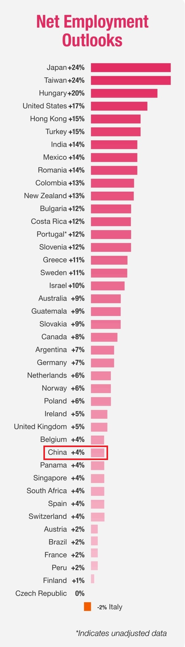 萬(wàn)寶華盛ManpowerGroup最新的雇傭前景調(diào)查顯示,2017年第三季度,受調(diào)查的43個(gè)地區(qū)中,有41個(gè)地區(qū)的雇主計(jì)劃擴(kuò)大招聘。其中,招聘意愿最強(qiáng)烈的地區(qū)是日本、臺(tái)灣、匈牙利和美國(guó),而意大利、捷克、芬蘭等地的雇主招聘意愿最低。亞太地區(qū),中國(guó)和新加坡兩地的雇主招聘意愿最低。(美通社,2017年6月11日洛杉磯)