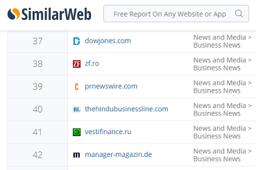 此外,PRNewswire.com在最近公布的Similar Web商業(yè)新聞網(wǎng)站排名中位居第39位,是企業(yè)新聞稿發(fā)布領(lǐng)域的最好名次,一同上榜的網(wǎng)站還有華爾街日報(bào)(5位),經(jīng)濟(jì)學(xué)人(18位)和道瓊斯(37位)等。
