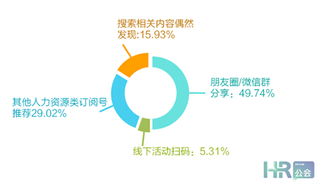 參與調研的人群中,人力資源專員/主管占比68.36%,人力資源經理/總監(jiān)及以上級別占比31.64%,其中有49.74%的受訪者表示通過朋友圈獲取人力資源相關信息的。看來,朋友圈除了提供“點贊之交”外,還是分享知識的重要平臺。
