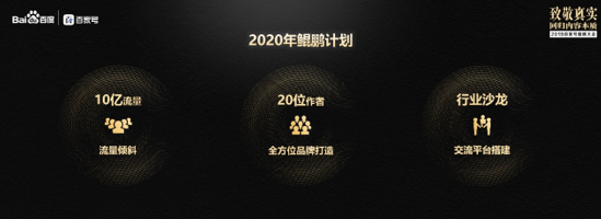 12月19日,以“致敬真實(shí),回歸內(nèi)容本質(zhì)”為主題的2019百度百家號(hào)鯤鵬大會(huì)在京舉辦,20多名學(xué)者、專家和優(yōu)秀的內(nèi)容創(chuàng)作者匯聚一堂,探討新形勢下優(yōu)質(zhì)泛科技類內(nèi)容的生存現(xiàn)狀和未來走向。同時(shí),百家號(hào)宣布將在2020年推出10億鯤鵬專屬流量扶持計(jì)劃,持續(xù)對優(yōu)質(zhì)內(nèi)容進(jìn)行流量傾斜,并將幫助優(yōu)秀的泛科技類內(nèi)容創(chuàng)作者打造個(gè)人IP,并匹配全方位的包裝資源,助推泛科技領(lǐng)域優(yōu)質(zhì)內(nèi)容在百家號(hào)平臺(tái)快速成長并彰顯價(jià)值。
