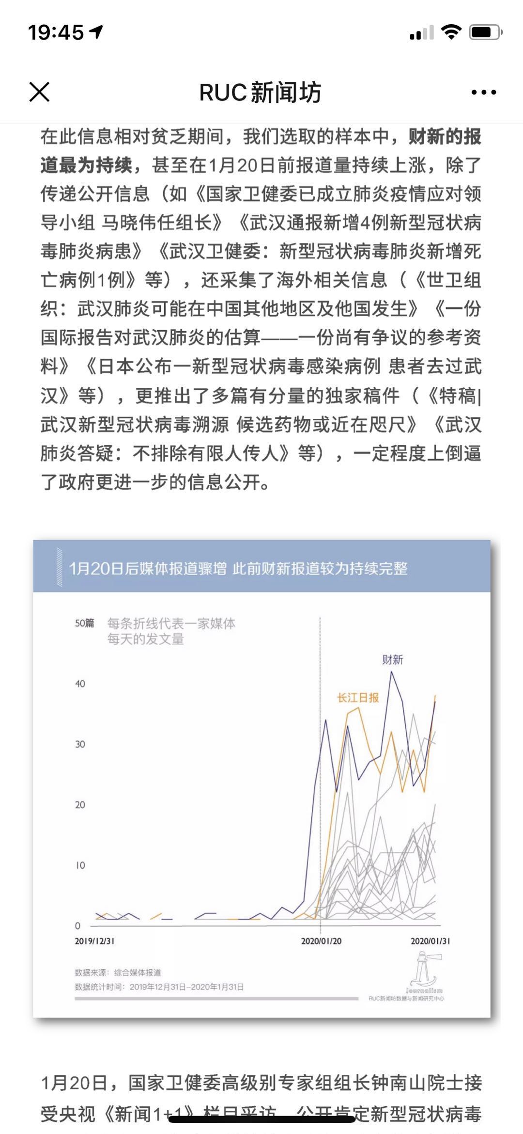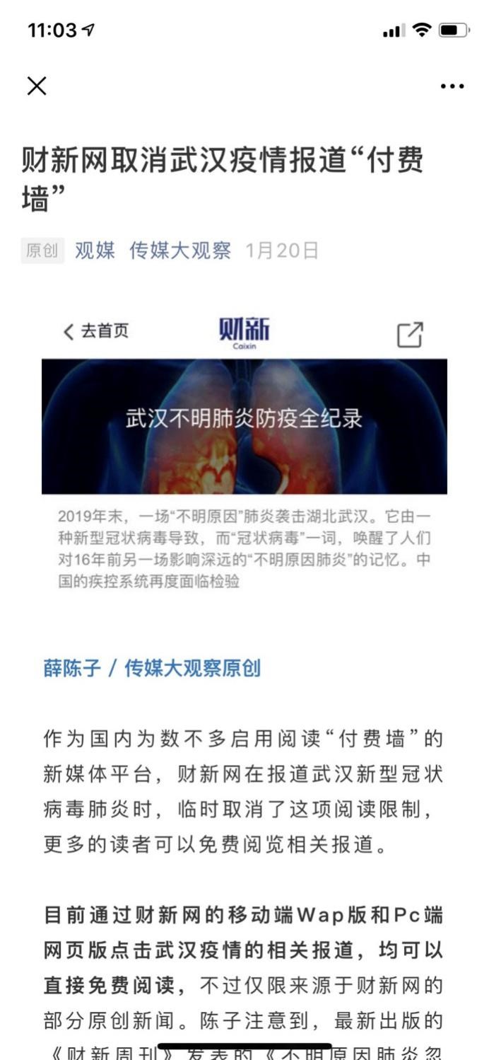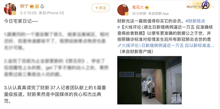 在新冠肺炎疫情的報(bào)道過程中,以財(cái)新為代表的部分媒體體現(xiàn)出專業(yè)新聞媒體的責(zé)任與擔(dān)當(dāng)。重大事件的報(bào)道,財(cái)新團(tuán)隊(duì)從不缺席。網(wǎng)友這樣評(píng)論他們: