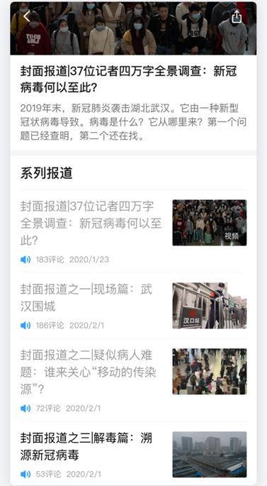 財(cái)新是最早關(guān)注疫情的媒體之一,并多維度解讀,包括頭條重磅、解藥系列、數(shù)據(jù)解析、肺炎日記、實(shí)時(shí)地圖等。隨著疫情升級(jí)為全國(guó)重大公共事件,財(cái)新對(duì)疫情取消閱讀“付費(fèi)墻”,讓公眾了解及時(shí)、全面的疫情信息,這一舉措受到業(yè)內(nèi)和讀者贊許。