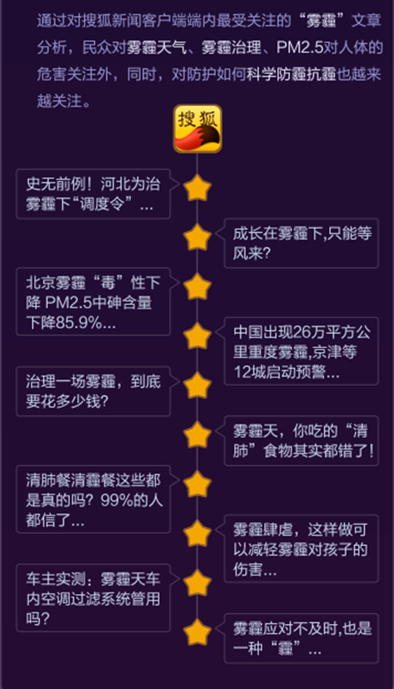 報告顯示,用戶不僅關(guān)注霧霾天對人體的“危害”,同時對“如何科學(xué)防霾抗霾”以及國家出臺了哪些“治霾政策”也越來越關(guān)注?;诖耍押侣効蛻舳藶橛脩籼峁┝嗽S多關(guān)于“清肺食譜”、霧霾天如何“食療養(yǎng)生”以及“孕媽媽如何養(yǎng)肺”等內(nèi)容的文章,受到用戶的廣泛閱讀和分享,成為“霧霾”肆虐期間搜狐新聞客戶端中的熱門文章。