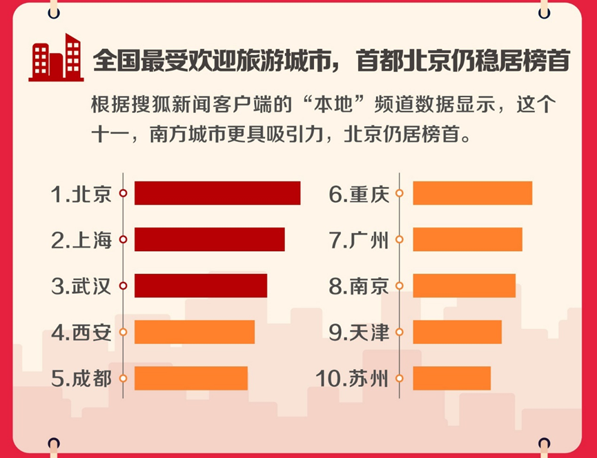 搜狐新聞客戶端還充分挖掘“本地頻道”數(shù)據(jù),通過數(shù)據(jù)處理和分析,探知數(shù)據(jù)背后隱藏的規(guī)律,抑或用戶擔(dān)憂的社會問題。報告顯示,全國最具吸引力的旅游城市包括北京、上海、廣州和成都等城市;有趣的是,這些最受歡迎旅游城市的市民比其他城市更加關(guān)注“十一長假”的相關(guān)信息,似乎更想“出去看看”,正所謂“外面的人想進來,里面的人想出去”。與此同時,“堵車”“臺風(fēng)”“霧霾”“黃色預(yù)警”等負面詞匯也登上新聞熱搜排行榜,說明用戶在策劃旅行路線的同時也為交通和天氣問題擔(dān)憂。