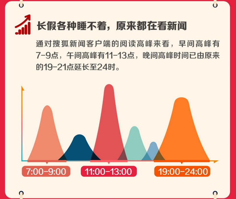 搜狐新聞客戶端不僅滿足于對用戶數(shù)據(jù)的靜態(tài)分析,還十分重視對用戶閱讀時段的階段性研究和趨勢分析。報告顯示,國慶期間用戶的閱讀高峰段出現(xiàn)延長的變化,說明用戶的閱讀需求增大。為此,搜狐新聞客戶端通過“混合推薦”、“垂直標(biāo)簽”和“搜索閱讀”等功能,對相應(yīng)時段的新聞推送做出了及時的增加和調(diào)整,立足于用戶特定時期的閱讀需求,為用戶提供全面科學(xué)的參考。