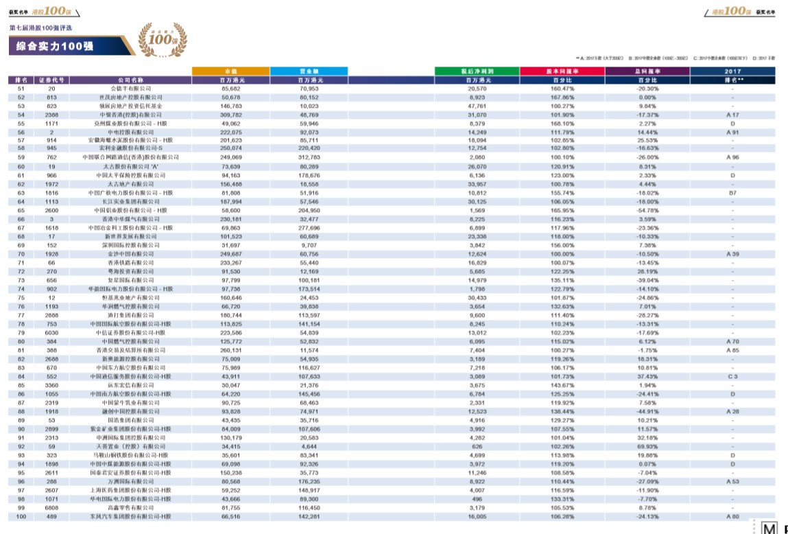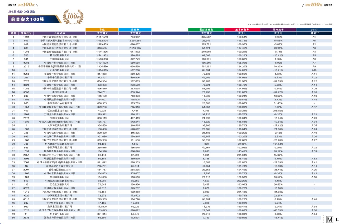 以客觀、專業(yè)、公正、準(zhǔn)確為指導(dǎo)準(zhǔn)則,通過評(píng)選出年度表現(xiàn)優(yōu)秀的港股上市公司,歷屆“港股100強(qiáng)”頒獎(jiǎng)典禮致力于為投資者提供有價(jià)值的投資參考,推進(jìn)內(nèi)地與香港資本市場(chǎng)數(shù)據(jù)的整合,推進(jìn)國(guó)家產(chǎn)業(yè)結(jié)構(gòu)升級(jí)、經(jīng)濟(jì)的發(fā)展。