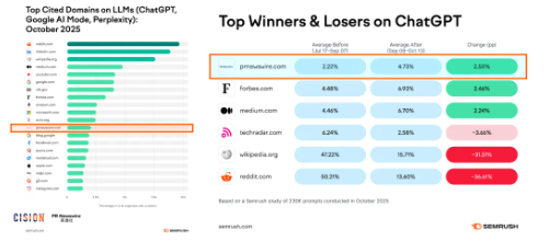 再來看一個(gè)調(diào)查數(shù)據(jù):下圖是Semrush在去年10月份,基于23萬條真實(shí)的AI提問做的一項(xiàng)研究。他們統(tǒng)計(jì)了ChatGPT、Google Gemini最常引用的網(wǎng)站來源。而美通社的官網(wǎng)PRNewswire.com的排名在第14位,超過大量的我們傳統(tǒng)認(rèn)知中的知名網(wǎng)站與內(nèi)容平臺。