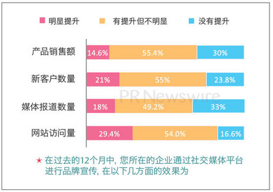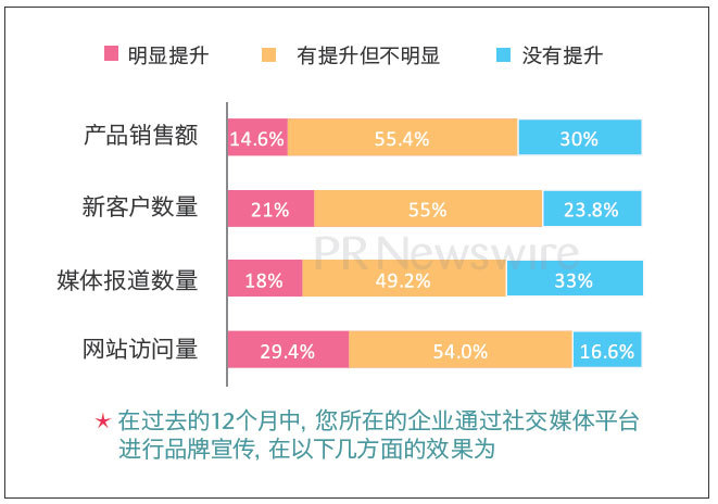 在過去12個月中,有近三成的企業(yè)表示社交媒體為企業(yè)網(wǎng)站所帶來的流量“明顯上升”,分別有超過半數(shù)的企業(yè)表示社交媒體平臺為企業(yè)帶來的新客戶數(shù)量及產(chǎn)品銷售額的影響“有提升但并不明顯”,2成左右的企業(yè)表示“有明顯提升”,在“媒體報道數(shù)量”方面,有18%的企業(yè)表示有“明顯提升”。