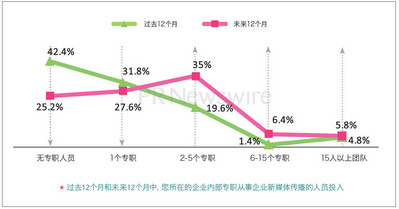 過去12個月和未來12個月中,您所在的企業(yè)內(nèi)部專職從事企業(yè)新媒體傳播的人員投入