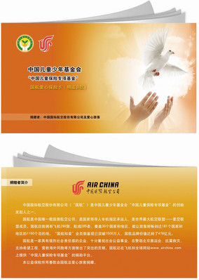 “中國兒童保險專項基金”是通過公益化的保險手段為3-15歲兒童健康提供的中國兒童大病醫(yī)療專項保險慈善項目。國航本著“滿足社會需求,創(chuàng)造共有價值”的企業(yè)目標積極參加了該項基金的運作和宣傳。國航自2009年4月9日成為“中國兒童保險專項基金”的創(chuàng)始發(fā)起人之一后,已向該基金捐款人民幣100萬元,其中50萬元為河北蔚縣2.5萬名兒童購置了兒童重大疾病保險卡。