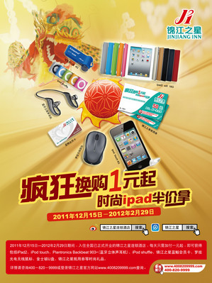 該活動覆蓋全國31個省、144個城市,400多家已開業(yè)的連鎖酒店。本次仍采取“兌獎券”的形式,凡在活動期間入住錦江之星旗下的任一錦江之星連鎖酒店、百時快捷酒店或白玉蘭酒店,每間夜都可得到一張“兌獎券”,現(xiàn)場開獎,當場登記兌換,即開即中,中獎率100%。同時通過錦江之星官方網(wǎng)站www.4008209999.com 預(yù)訂,并在活動期間內(nèi)入住,可再獲得系統(tǒng)抽獎機會。系統(tǒng)每天抽出2名網(wǎng)站幸運獎,每周抽出2名網(wǎng)站驚喜獎。中獎賓客名單將公布于錦江之星官方網(wǎng)站。此次優(yōu)惠活動的獎品除了千足金兔、iPAD 等大獎外,還有 ipod touch、ipod nano、ipod shuffle 等時尚數(shù)碼獎品。另有錦江之星會員卡、30元房費折扣、兩面針旅行套裝等實惠禮物。