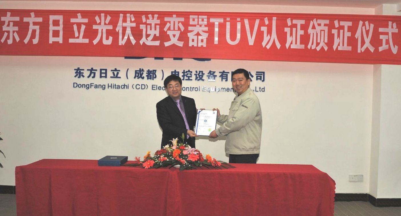 成都2011年1月28日電 /美通社亞洲/ --TUV南德意志集團(tuán)(TUV SUD)為東方日立光伏并網(wǎng)逆變器頒發(fā)TUV SUD認(rèn)證證書。當(dāng)日,TUV南德意志集團(tuán)、東方日立公司、東方電氣股份有限公司、東方國際合作公司的有關(guān)領(lǐng)導(dǎo)和職能部門負(fù)責(zé)人參加了頒證儀式。TUV南德意志集團(tuán)華中、華西總經(jīng)理蔣丹峰先生向東方日立頒發(fā)了TUV SUD證書。