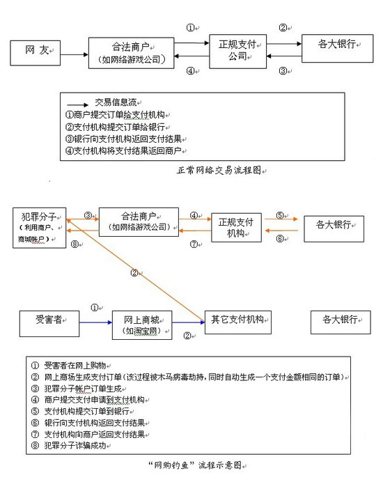 示意圖如上(如圖所示,“正規(guī)支付機構(gòu)”兩端的流程都是正常流程,無法分辨是騙子還是受害者;但“網(wǎng)上商城”、“合法商戶”有責任追索到騙子):