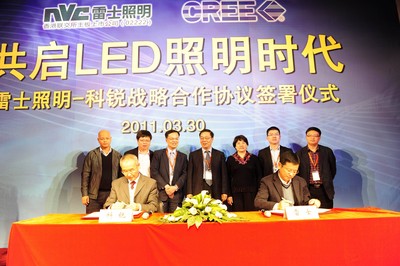 3月30日,LED 照明領(lǐng)域再次擲出重磅炸彈,雷士照明與科銳公司(CREE)在上海新國(guó)際展覽會(huì)簽署戰(zhàn)略合作協(xié)議,進(jìn)行強(qiáng)強(qiáng)聯(lián)合,開啟 LED 照明高端市場(chǎng)發(fā)展的新篇章。雷士照明常務(wù)副總裁殷慷先生和科銳中國(guó)市場(chǎng)總經(jīng)理唐國(guó)慶先生分別作為雙方代表簽署戰(zhàn)略合作協(xié)議。同時(shí)科銳副總裁兼中國(guó)區(qū)總經(jīng)理施毓?fàn)N先生、中國(guó)照明電器協(xié)會(huì)理事長(zhǎng)陳燕生先生、中國(guó)照明電器協(xié)會(huì)副理事長(zhǎng)兼秘書長(zhǎng)劉升平女士、中國(guó)照明電器協(xié)會(huì)副秘書長(zhǎng)竇林平先生應(yīng)邀出席,共同見證此次簽約儀式。