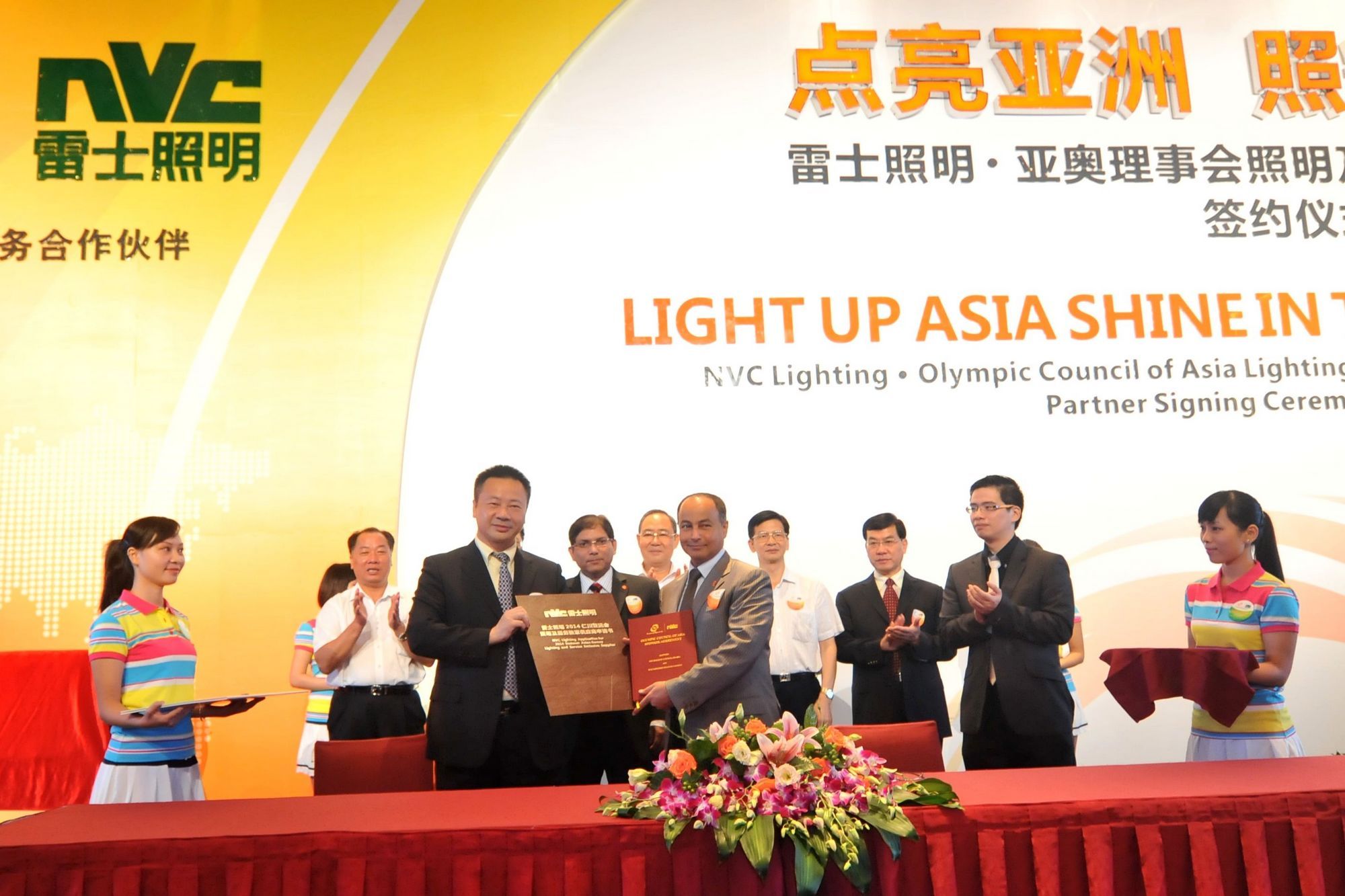 在與會者共同見證下,雷士照明董事長吳長江和亞奧理事會總干事侯賽因作為雙方代表現(xiàn)場簽字,雷士照明正式成為“亞奧理事會照明及服務合作伙伴”。隨后,在歡慶喜悅的氣氛中,雷士照明與亞奧理事會互贈了紀念禮品。