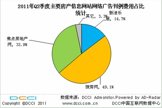 DCCI Admonitor 2011年第二季度網(wǎng)絡(luò)廣告投放監(jiān)測數(shù)據(jù)顯示,2011年第二季度專業(yè)房產(chǎn)信息網(wǎng)站的刊例費(fèi)大都出現(xiàn)了上漲,其中搜房網(wǎng)的刊例費(fèi)位居第一,其營收規(guī)模突破億元大關(guān),達(dá)到1.23億元,焦點(diǎn)房地產(chǎn)網(wǎng)和新浪樂居位列二、三位;搜房網(wǎng)在房產(chǎn)信息服務(wù)網(wǎng)站網(wǎng)絡(luò)廣告總刊例費(fèi)用比例接近50%,遙遙領(lǐng)先其它網(wǎng)站。2011年第二季度房產(chǎn)信息網(wǎng)站的廣告投放規(guī)模出現(xiàn)了明顯的回暖與增長。