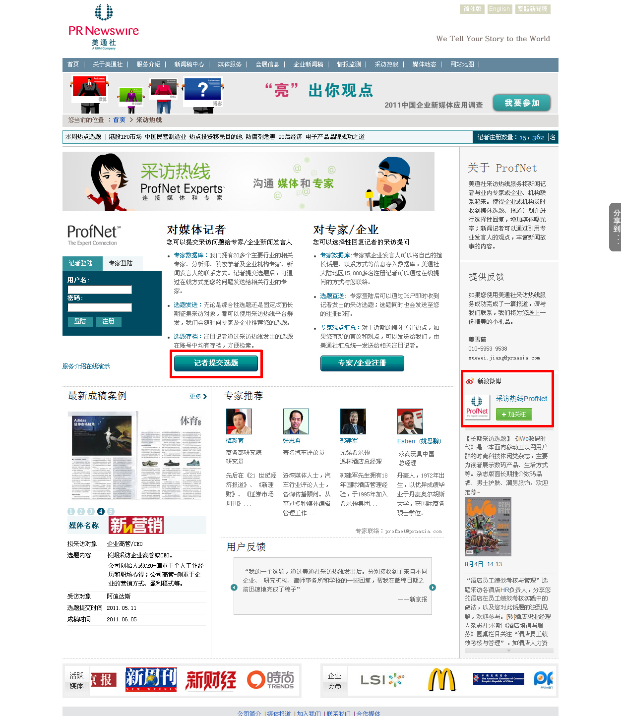 美通社中文采訪熱線是國(guó)內(nèi)首個(gè)也是唯一實(shí)時(shí)收集媒體采訪選題的媒體情報(bào)服務(wù),改版后的采訪熱線平臺(tái)更加簡(jiǎn)潔易用,媒體選題提交與專家在線注冊(cè)各項(xiàng)功能清晰劃分,并集成了新浪微博@采訪熱線ProfNet 內(nèi)容實(shí)時(shí)展示、國(guó)內(nèi)主流社交媒體平臺(tái)一鍵分享功能,記者用戶可以通過(guò)“快速提交選題”按鈕,無(wú)需注冊(cè)輕松提交發(fā)送相關(guān)選題提問(wèn),并可通過(guò)新浪微博@采訪熱線 ProfNet 私信功能快速提問(wèn),通過(guò)微博與行業(yè)專家、分析師、企業(yè)新聞發(fā)言人保持實(shí)時(shí)互動(dòng)。