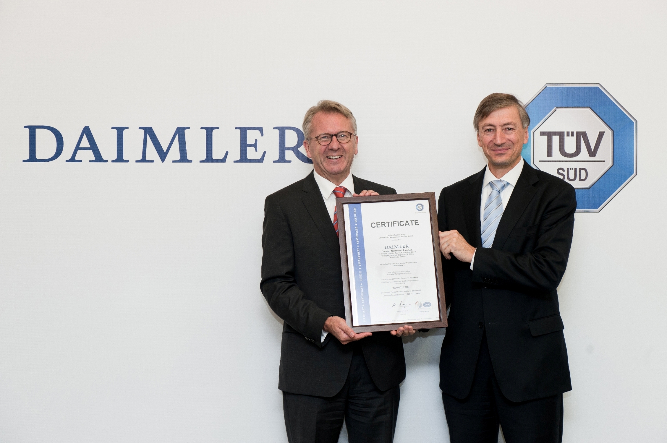 北京2011年9月20日電 /美通社亞洲/ --繼戴姆勒東北亞投資有限公司(以下簡稱戴姆勒東北亞)通過 TUV 南德意志集團(以下簡稱TUV SUD)審核之后,VDA6.2: 2004認(rèn)證證書頒發(fā)儀式在北京戴姆勒大廈舉行。TUV SUD 管理服務(wù)股份有限公司 (TUV SUD Management Service GmbH) CEO:Peter Schaff 博士在儀式中向戴姆勒東北亞董事長兼首席執(zhí)行官華立新(Ulrich Walker)先生頒發(fā)了證書。TUV SUD 大中華集團總裁兼 CEO 范華德(Dirk von Wahl)先生也參加了此次儀式。這是 TUV SUD 在亞洲地區(qū)首個頒發(fā)給汽車集團的 VDA6.2證書,同時,戴姆勒東北亞旗下的6個子公司也各自獲得了相應(yīng)的業(yè)務(wù)證書,全面覆蓋了戴姆勒東北亞在中國大陸、臺灣、韓國的梅賽德斯-奔馳乘用車、商用車、汽車金融和零部件業(yè)務(wù)。