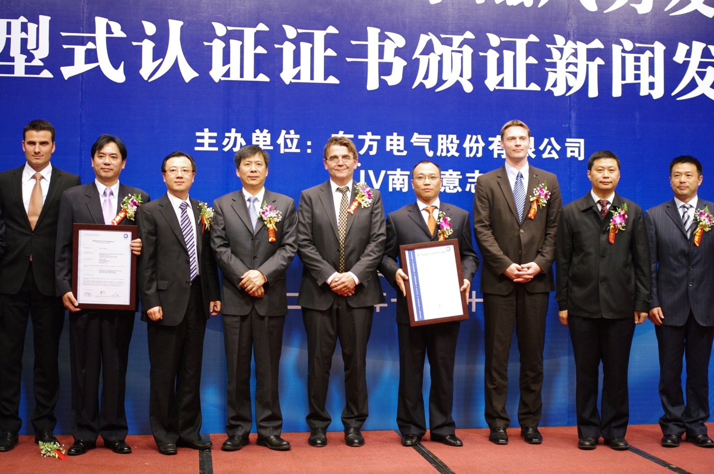 2011年10月20日,東方電氣集團(tuán)東方電機(jī)有限公司獨資子公司東方電氣新能源設(shè)備(杭州)有限公司公司(以下簡稱“新能源公司”)生產(chǎn)的DF82-1500直驅(qū)永磁風(fēng)力發(fā)電機(jī)組通過TUV 南德意志集團(tuán)(以下簡稱“TUV SUD”)按照 GL 導(dǎo)則進(jìn)行的 A 級設(shè)計評估和型式認(rèn)證,頒證儀式在北京國際風(fēng)能大會暨展覽會期間舉行。TUV 南德意志集團(tuán)風(fēng)能部經(jīng)理 Martin Webhofer博士和 TUV SUD大中華集團(tuán)副總裁Wolfgang Hübl先生在儀式中分別向新能源公司技術(shù)開發(fā)部部長鄭北超先生及新能源公司總經(jīng)理詹明先生頒發(fā)了設(shè)計認(rèn)證和型式認(rèn)證證書。TUV SUD 大中華集團(tuán)高級副總裁金燦先生、TUV SUD風(fēng)能部總經(jīng)理Ernst Donislreiter先生、東方電氣集團(tuán)黨組成員、副總經(jīng)理朱元巢先生、東方電氣集團(tuán)東方電機(jī)有限公司總經(jīng)理賀建華先生、東方電機(jī)有限公司副總經(jīng)理、新能源公司董事長蘭向軍先生等出席并且見證了本次儀式。