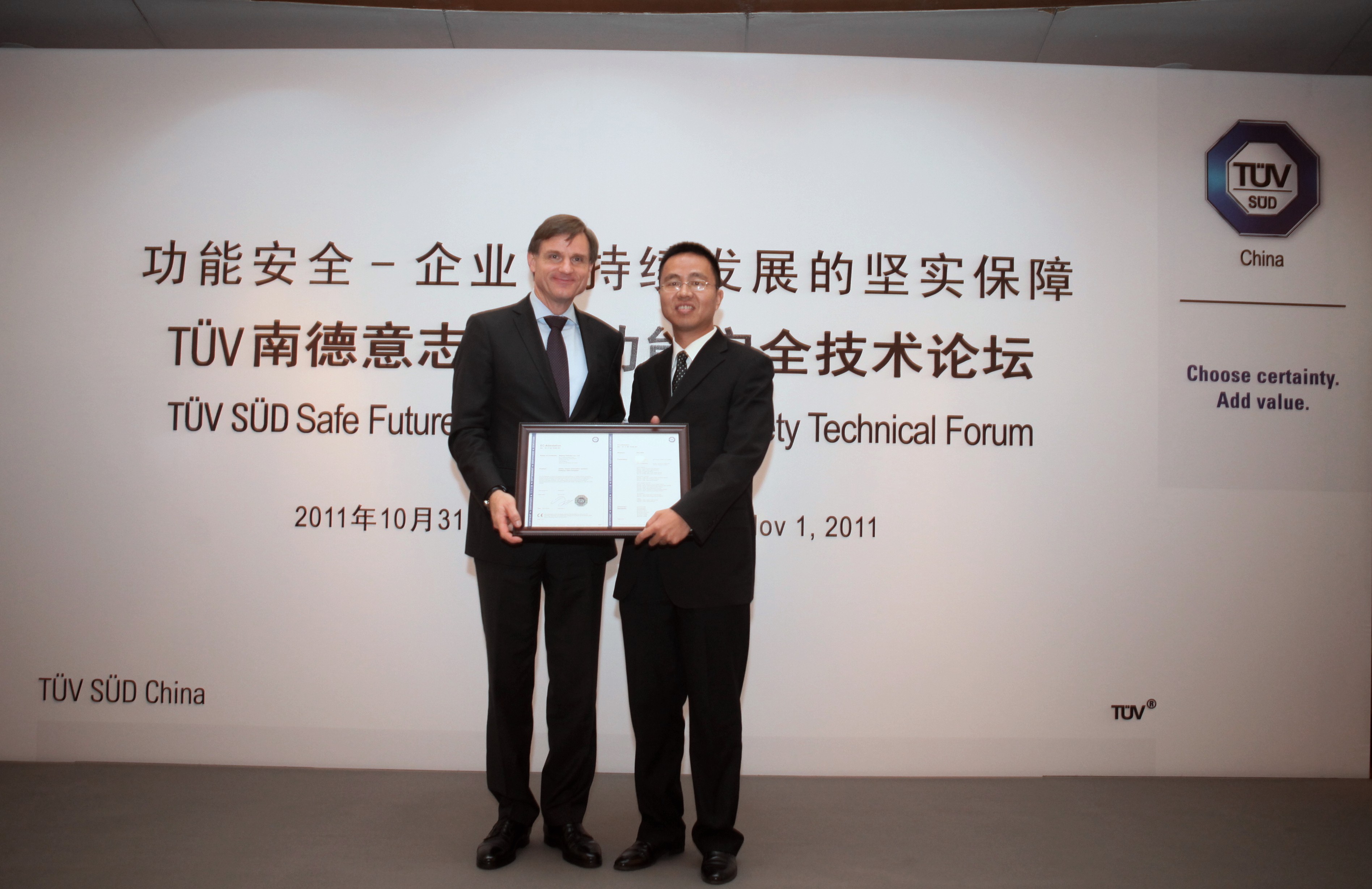 北京2011年11月1日電 /美通社亞洲/ -- 繼北京和利時(shí)系統(tǒng)工程有限公司(以下簡(jiǎn)稱“和利時(shí)”)通過(guò) TUV 南德意志集團(tuán)(以下簡(jiǎn)稱“TUV SUD”)專業(yè)的第三方功能安全評(píng)估與認(rèn)證之后,在 TUV SUD “功能安全技術(shù)論壇”活動(dòng)中,TUV SUD 向和利時(shí)頒發(fā)了 SIL4 等級(jí)功能安全認(rèn)證證書(shū),這是 TUV SUD 在中國(guó)頒發(fā)的首張 SIL4 等級(jí)功能安全認(rèn)證證書(shū),標(biāo)志著和利時(shí)的產(chǎn)品和技術(shù)已經(jīng)達(dá)到了功能安全完整性的較高等級(jí)要求,正式拿到進(jìn)入歐洲及國(guó)際軌道市場(chǎng)的通行證。儀式中,TUV SUD 大中華集團(tuán)總裁 & CEO 范華德(Dirk von Wahl)先生為北京和利時(shí)系統(tǒng)工程有限公司軌道交通自動(dòng)化事業(yè)部設(shè)計(jì)中心常務(wù)副總經(jīng)理李劍先生頒發(fā)證書(shū)。