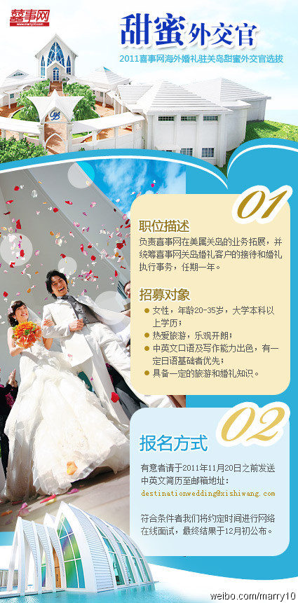 “喜事網(wǎng)”官網(wǎng)上這樣介紹,應(yīng)聘成功者從開始工作之日起進(jìn)行為期一年的“甜蜜外交官”的工作。應(yīng)聘者應(yīng)具備熱情友善的個性、良好的中英文溝通能力、對婚禮行業(yè)具備一定的知識。相信只有能夠品評優(yōu)質(zhì)服務(wù)、美食和環(huán)境,并能在工作中發(fā)揮主動性且具有良好的組織能力的那位幸運者將最終被送往關(guān)島。
