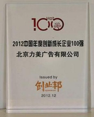 北京2011年12月5日電 /美通社亞洲/ -- 12月2日,“2011創(chuàng)業(yè)邦年會(huì)暨創(chuàng)業(yè)邦100年度頒獎(jiǎng)典禮”上,“創(chuàng)新成長(zhǎng)企業(yè)100強(qiáng)”新鮮出爐,北京力美廣告有限公司榜上有名。