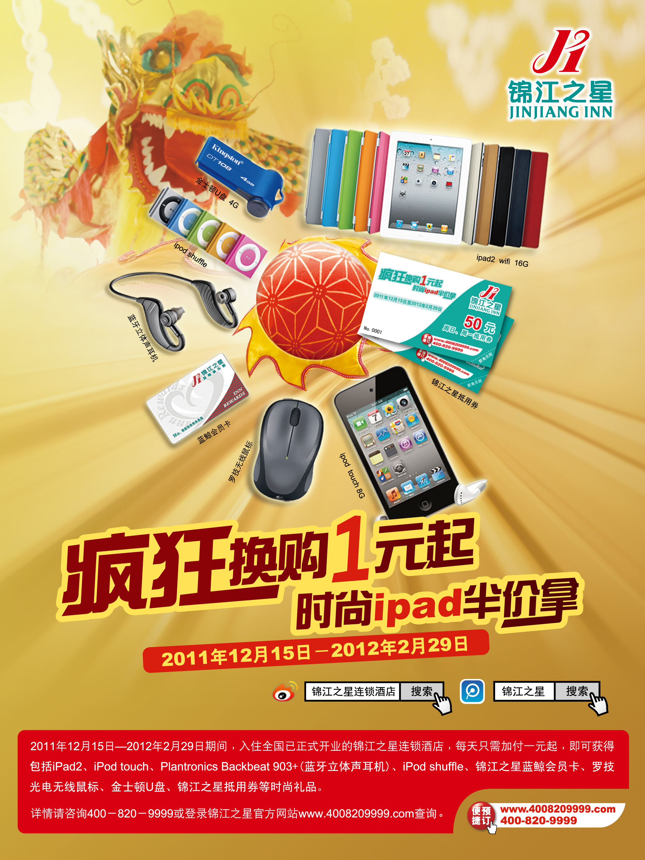 上海2011年12月6日電 /美通社亞洲/ -- 在連續(xù)兩年推出“千萬(wàn)獎(jiǎng)品別錯(cuò)過”活動(dòng)引爆春節(jié)市場(chǎng)后,錦江之星將于2012年春節(jié)期間再掀優(yōu)惠風(fēng)暴。從2011年12月15日起,至2012年2月29日,錦江之星將推出“瘋狂換購(gòu)1元起,時(shí)尚iPad半價(jià)拿”主題優(yōu)惠活動(dòng),錦江之星體驗(yàn)券、藍(lán)鯨會(huì)員卡和眾多時(shí)尚數(shù)碼獎(jiǎng)品,只要1元起,即可超值換購(gòu)。