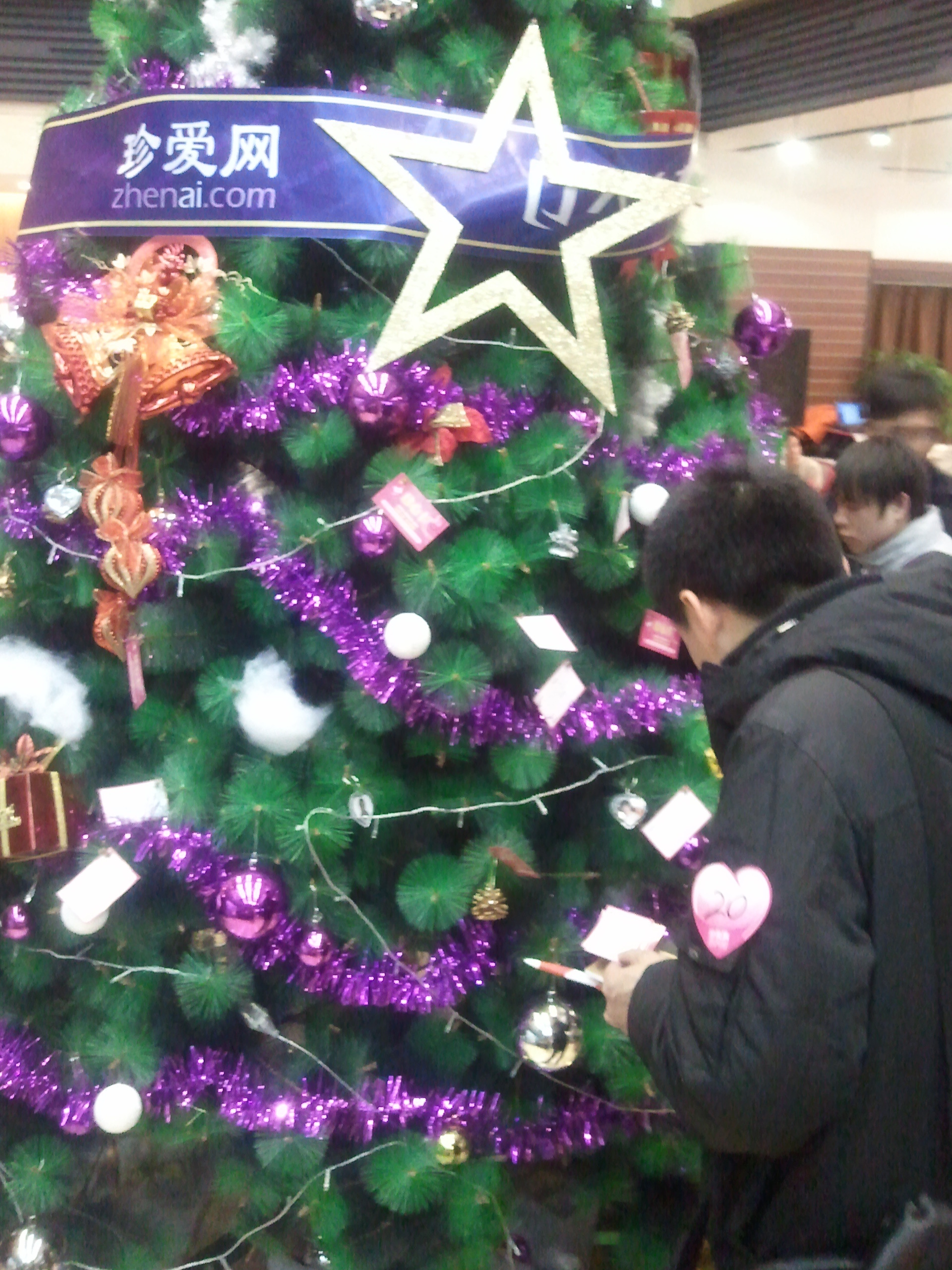 精心制作的圣誕愛情樹成為了此次活動(dòng)的一大亮點(diǎn)。在這顆圣誕樹上掛滿了心形水晶鑰匙鏈,里面含有珍愛網(wǎng)單身會(huì)員的照片ID、以及他們關(guān)于來年“脫光”的愿望。不管是參加活動(dòng)的會(huì)員還是路人,只要是單身人士都可以通過這些心形水晶鑰匙鏈尋找中意的另一半。找到照片背面的珍愛網(wǎng)ID并聯(lián)系珍愛紅娘,就可以將自己的心意傳遞給這位有緣人,為自己來年的幸福爭取無限可能。