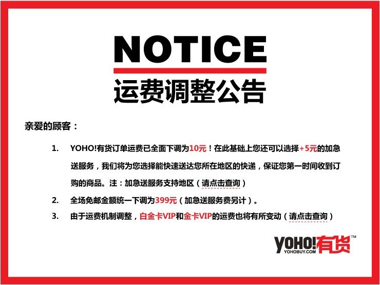 2012年起,YOHO!有貨將原來(lái)每單15元的運(yùn)費(fèi)下調(diào)至10元,購(gòu)物滿一定金額可免郵的門(mén)檻也由原來(lái)的500元下調(diào)至399元。YOHO!有貨物流負(fù)責(zé)人許凱介紹:“在快遞漲聲一片的大環(huán)境下,我們承擔(dān)差價(jià)補(bǔ)貼來(lái)下調(diào)運(yùn)費(fèi),希望降低用戶潮流網(wǎng)購(gòu)的門(mén)檻。在此基礎(chǔ)上,仍會(huì)保持以往優(yōu)質(zhì)的物流服務(wù),運(yùn)費(fèi)降了,服務(wù)不能降?!贬槍?duì)節(jié)假日的購(gòu)物高峰,YOHO!有貨還推出加急送服務(wù),從訂單審核、物流制單、揀貨包裝、分撿出庫(kù)等各環(huán)節(jié)采取優(yōu)先措施,更大程度上滿足不同用戶的物流需求。