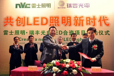 惠州2012年1月16日電 /美通社亞洲/ -- 2012年1月13日,中國(guó)照明行業(yè)龍頭企業(yè) -- 雷士照明(香港主板上市代號(hào):2222.HK)與中國(guó)領(lǐng)先的LED封裝企業(yè) -- 瑞豐光電(全稱“深圳市瑞豐光電子股份有限公司”,股票代碼:300241.SZ)在廣東惠州舉行“共創(chuàng)LED照明新時(shí)代 -- 雷士照明·瑞豐光電LED合資項(xiàng)目簽約啟動(dòng)儀式暨新聞發(fā)布會(huì)”活動(dòng),雙方強(qiáng)強(qiáng)聯(lián)合,優(yōu)勢(shì)互補(bǔ),資源共享,開(kāi)啟一個(gè)共贏 LED 照明新局面,全面推動(dòng)行業(yè) LED 產(chǎn)業(yè)鏈升級(jí)與發(fā)展變革。