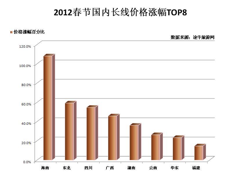 國內(nèi)游方面,華北、海南、四川等熱門方向漲幅也不容小覷,如上海出發(fā)至四川方向的雙飛6日線路,全年平均價格在2500元左右,春節(jié)期間價格在4000元左右;上海至華北方向的春節(jié)價格漲幅也在1000-2000元不等?!敖衲甏汗?jié)上海市民出境游相對明顯,去往海南方向的人數(shù)占比較春節(jié)前倒是略有下降,這與上海市民較為成熟的出游觀念是分不開的,錯峰出游,避開熱門方向的最熱時段,能夠更好地享受旅游目的地的服務(wù)和風景,”途牛旅游網(wǎng)工作人員建議市民在選擇旅游目的地時,如有條件盡量避開“人潮洶涌”的過熱方向。