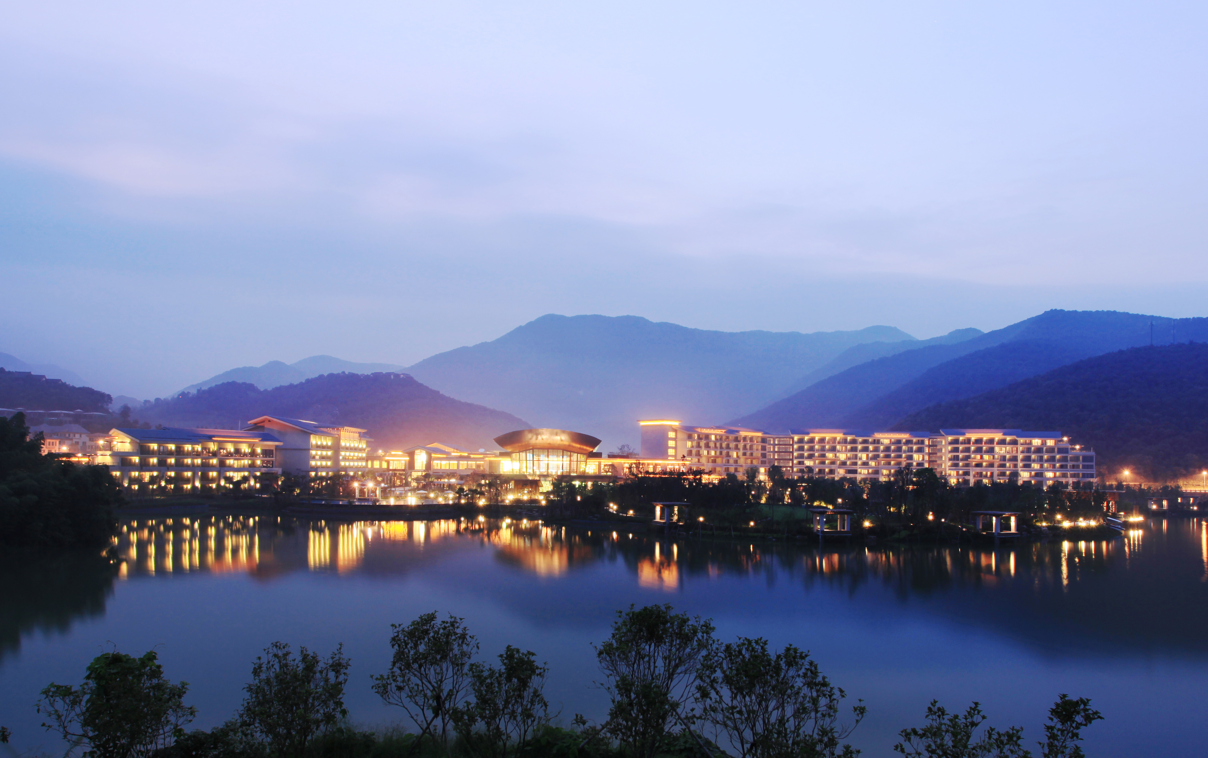 九龍湖是國家4A級風(fēng)景區(qū),這里的森林面積約53000畝,景區(qū)內(nèi)鳳凰湖、九龍湖、孔雀湖、月亮湖四湖連珠,百種珍禽與多種奇松異柏棲息于此?!扒嗌脚P碧波,明鏡映黛峰?!本琵埡L(fēng)光旖旎,眾山懷抱,又有碧波蕩漾,與湖光山色交相輝映。一片片藍(lán)瓦白墻的建筑在群山的包圍中若隱若現(xiàn),一汪汪清澈的湖水在蒼翠的草坪上零星點綴,開元寧波九龍湖度假村的優(yōu)雅與精致贏得了劇組的青睞。