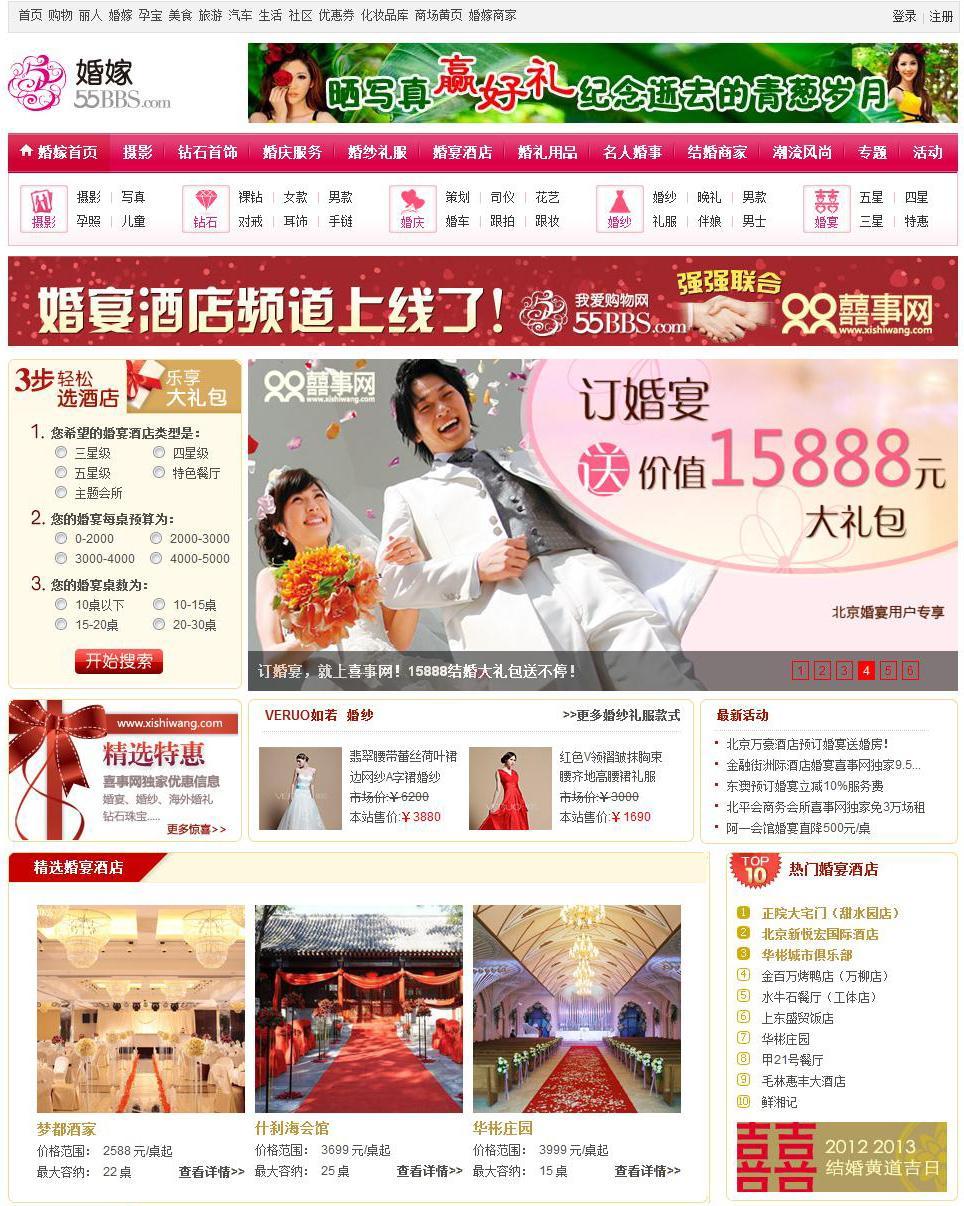 北京2012年6月5日電 /美通社亞洲/ -- 喜事網(wǎng)(國(guó)內(nèi)領(lǐng)先的婚宴預(yù)訂網(wǎng)站)已于2012年5月與“55BBS 我愛購(gòu)物網(wǎng)”達(dá)成戰(zhàn)略合作,在55BBS 婚嫁板塊強(qiáng)勢(shì)推出婚宴酒店頻道。此次婚宴酒店頻道整合了喜事網(wǎng)最具優(yōu)勢(shì)、最具特色的酒店及各類結(jié)婚服務(wù)資源,竭力為結(jié)婚的新人朋友提供方便快捷的一站式婚宴預(yù)訂服務(wù)。