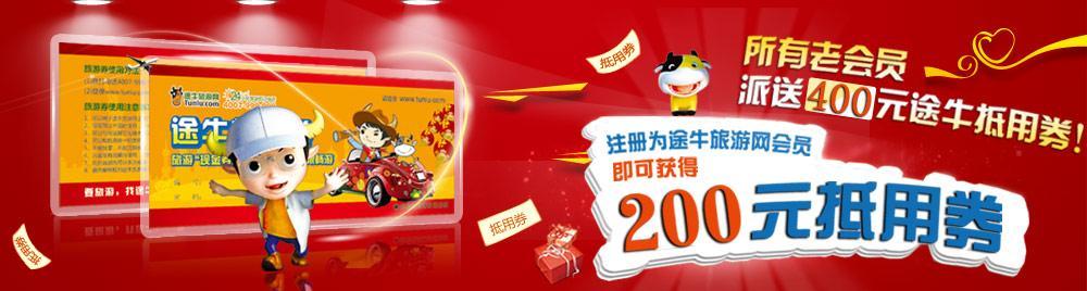 北京和上海2012年6月5日電 /美通社亞洲/ -- 即日起,途牛旅游網(wǎng)向各位新老會(huì)員派送抵用券:新會(huì)員注冊禮 -- 只要注冊成為途牛旅游網(wǎng)會(huì)員,即可獲得200元途牛抵用券;老會(huì)員答謝禮 -- 所有2012年05月21日前注冊的老會(huì)員可獲得400元途牛抵用券。途牛抵用券即領(lǐng)即用,繽紛旅游產(chǎn)品隨心挑。