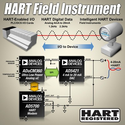 配套產(chǎn)品包括ADI公司的HART調(diào)制解調(diào)器IC AD5700(用于HART通信協(xié)議編碼與解碼的單芯片設計),以及用于環(huán)路供電型智能發(fā)射器應用的16位DAC AD5421。