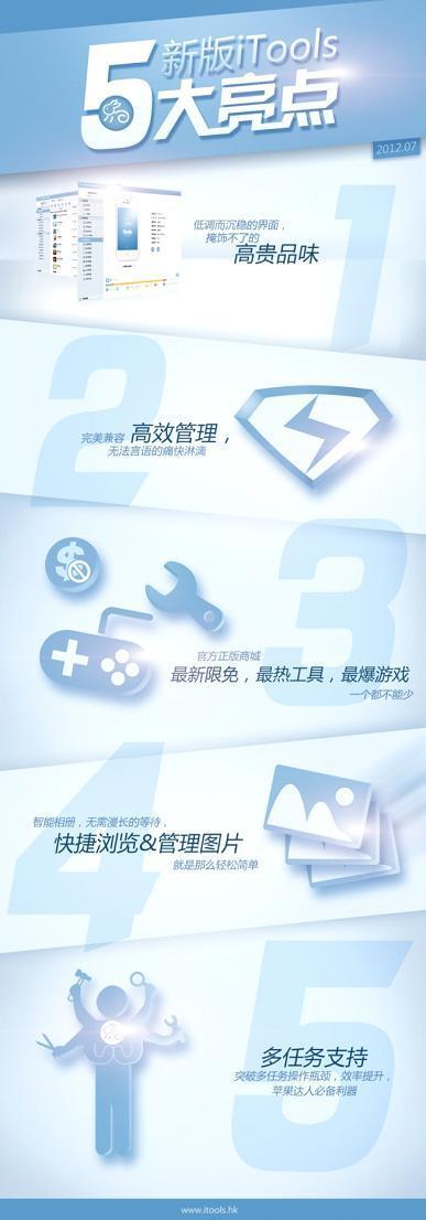 深圳2012年7月26日電 /美通社亞洲/ -- 由創(chuàng)想天空所開發(fā)的 iTools 新版于7月25日正式發(fā)布,為移動互聯(lián)網(wǎng)行業(yè)注入一劑強心劑。iTools 是一個蘋果輔助管理軟件。有別于其他類似的軟件,iTools 讓蘋果用戶盡管在沒有越獄的情況下,也可以非常方便的完成對蘋果設(shè)備的信息、音樂、鈴聲、電子書、圖片、桌面、軟件安裝、互聯(lián)網(wǎng)資源下載、系統(tǒng)信息的修改等工作,充分的滿足用戶的各種需求。