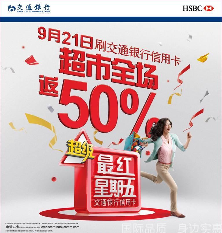 9月21日前,交通銀行信用卡持卡人通過交通銀行信用卡網(wǎng)站 http://creditcard.bankcomm.com 或直接撥打語音熱線4008893000注冊(cè)“最紅星期五超市活動(dòng)”后就可參與“超級(jí)最紅星期五”活動(dòng),同一持卡人名下所有交通銀行信用卡均可參加。持卡人注冊(cè)成功后,于9月21日活動(dòng)當(dāng)天在全國各城市“超級(jí)最紅星期五”合作超市內(nèi),任一單筆刷卡消費(fèi)滿128元人民幣,便可享受50%的高額刷卡金返還,較高可享500元刷卡金返還。