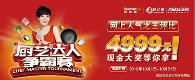 此外,10月1日至10月31日之間,沃爾瑪還將推出“廚藝達人爭霸賽”之“網(wǎng)上人氣之王評比”。所有門店初賽的冠軍比賽照片,將由沃爾瑪直接上傳到活動網(wǎng)站,進行網(wǎng)絡投票。其他網(wǎng)友亦可登陸活動網(wǎng)站 www.wmhuodong.com,點擊“廚藝達人爭霸賽”,將菜肴烹制過程的照片上傳(提交菜式不限數(shù)量),與所有門店初賽的冠軍一起,接受網(wǎng)友投票,參與“網(wǎng)上人氣之王評比”。獲得最多投票的選手將獲得一等獎,贏得4999元現(xiàn)金;3名二等獎達人將獲得1000元沃爾瑪購物卡;6名三等獎達人將獲得200元沃爾瑪購物卡(詳情以店內及網(wǎng)絡公告為準,請咨詢門店服務臺)。