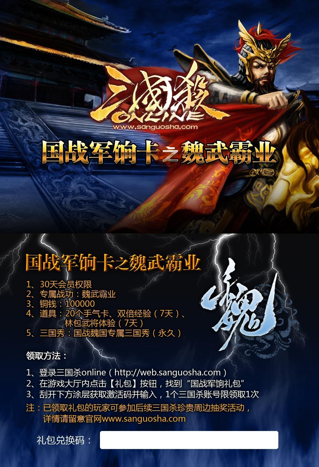 每套《三國殺—國戰(zhàn)》中都有一張國戰(zhàn)軍餉卡,刮開涂層獲取激活碼,登陸《三國殺OL》官網(wǎng)激活后,即可領取“國戰(zhàn)軍餉禮包”,豐厚的線上獎勵助玩家成為《三國殺OL》達人。禮包包括:30天會員權限,專屬戰(zhàn)功,100000銅錢,20張手氣卡,雙倍經(jīng)驗(7天),林包武將體驗(7天),永久國戰(zhàn)三國秀。值得一提的是,魏,蜀,吳,群雄四股勢力都有各自不同的專屬戰(zhàn)功和國戰(zhàn)三國秀。