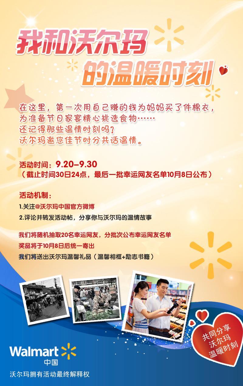 @沃爾瑪中國官方微博正式亮相的同時,將啟動“我與沃爾瑪?shù)臏嘏瘯r刻”網(wǎng)友線上活動,邀請網(wǎng)友在中秋佳節(jié)共話溫情,一起回憶美好生活的點滴。網(wǎng)友在9月20日至30日期間,關注@沃爾瑪中國官方微博,轉發(fā)活動貼,并分享他們與沃爾瑪?shù)臏厍楣适?,將有機會獲得沃爾瑪精心準備的溫馨相框和勵志書籍。