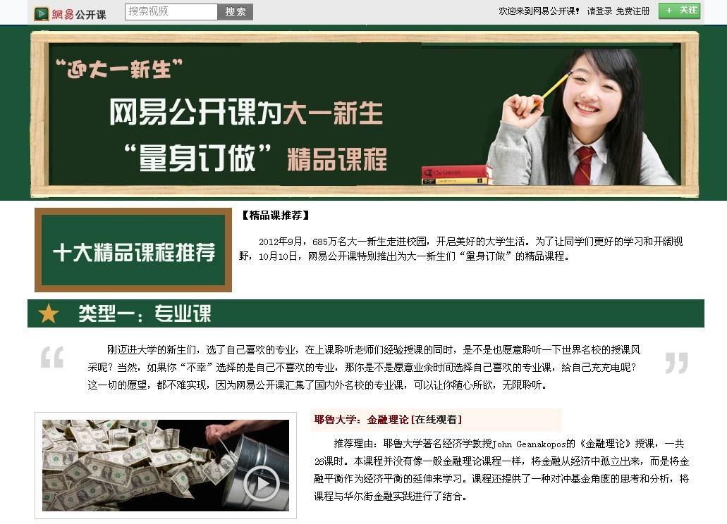 10月11日,網(wǎng)易公開課針對大一新生,特別推出了以上“量身訂做”的精品課程。該課程涵蓋專業(yè)課、基礎課、公共課、興趣課四大部分,多方面的給大一新生提供學習和生活支持。網(wǎng)易公開課相關(guān)負責人表示:“網(wǎng)易公開課現(xiàn)有幾十所國際國內(nèi)大學的課程、TED演講以及可汗學院,以后還會增加更多優(yōu)秀課程,努力打造成網(wǎng)上綜合大學?!?/p>